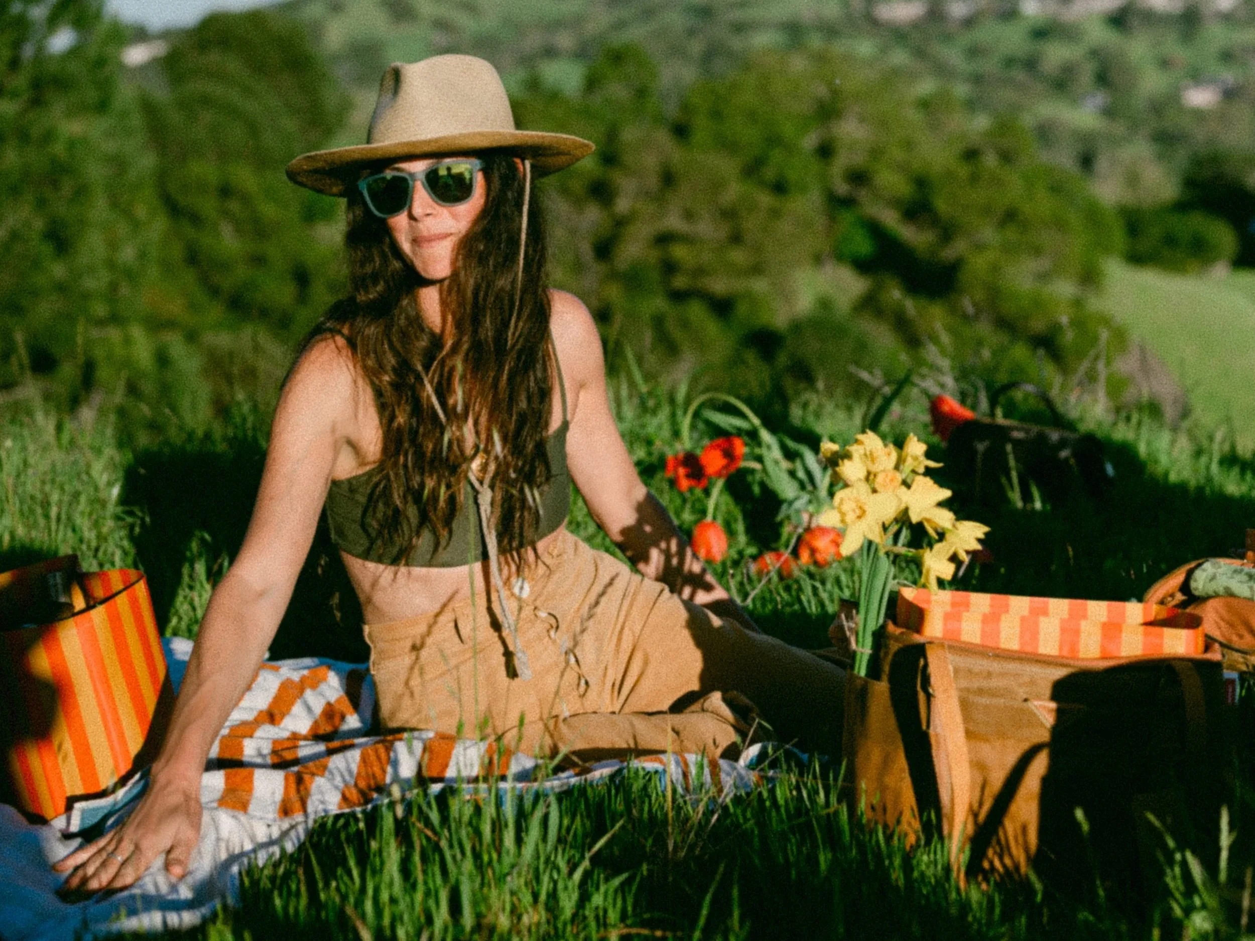 A dramatic trail down green rolling hills, through flowy grass, and past heaps of foraged acacia and lemon branches led 15 women to Quiet Town blankets—effortlessly strewn for a gathering where tulips bloomed as if they were growing straight from the soil…
