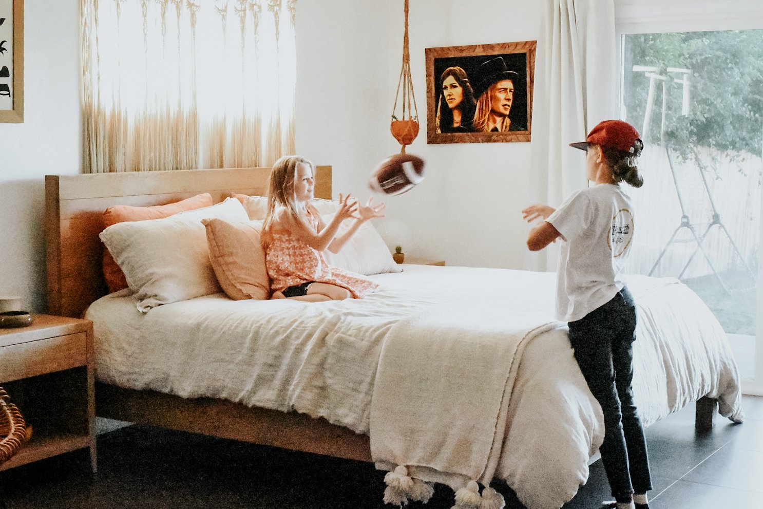 If you live in California, especially the southern, sandy side of the state, you have no doubt seen childhood joy on repeat, jumping in and out of waves in the raddest little retro swimwear. That would be thanks to Julia Wheeler of Seaesta Surf, a mom who wanted a better fit, more sustainable and higher quality materials than anything else on the market for her kids. Well, she nailed it, along with raising two, really awesome little groms with her husband, and of course a beautiful home that blends mid-century modern vibes with a love for art, music, custom built furniture (compliments of her equally talented husband) and a whole lotta surf-eat-nap. She’s cool, but not too cool to chat with us or anyone else about how cool she really is. Though she would never admit that, we’ll admit it for her and let you just see for yourself!